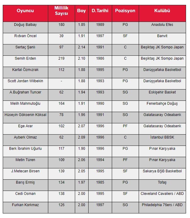 2019 FIBA Basketbol Dünya Kupası elemeleri kapsamında 28 Haziran Perşembe günü Ukrayna ve 1 Temmuz Pazar günü de İsveç ile karşılaşacak olan milli takımımızın kadrosu belli oldu.